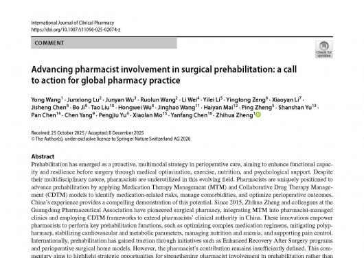 關(guān)于藥師利用MTM模式開展外科預(yù)康復(fù)的呼吁在《國際臨床藥學(xué)雜志》(IJCP)發(fā)表