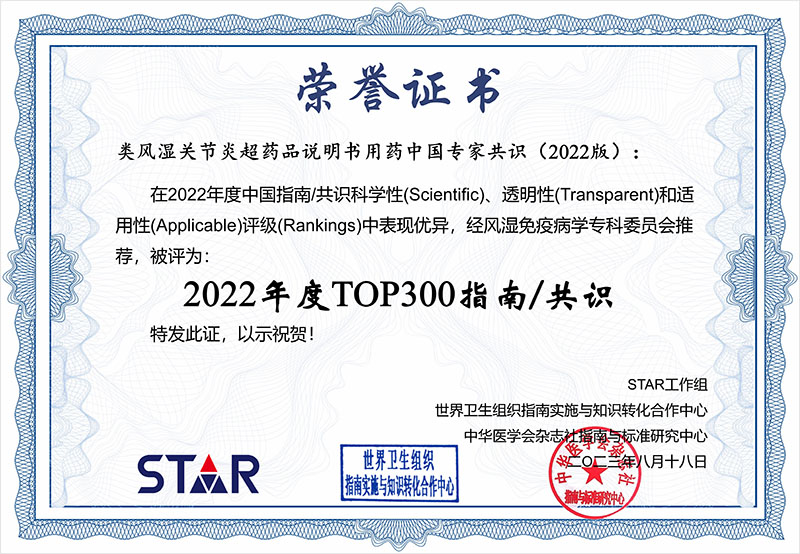 近期,STAR工作組對(duì)2022年指南和共識(shí)進(jìn)行了評(píng)級(jí)工作,由廣東省藥學(xué)會(huì)風(fēng)濕免疫用藥專(zhuān)家委員會(huì)發(fā)起、中山大學(xué)孫逸仙紀(jì)念醫(yī)院風(fēng)濕免疫科和藥學(xué)部制訂的《類(lèi)風(fēng)濕關(guān)節(jié)炎超藥品說(shuō)明書(shū)用藥中國(guó)專(zhuān)家共識(shí)(2022版)》被評(píng)選為2022年度TOP300指南/共識(shí)。STAR工作組,全稱(chēng)指南科學(xué)性(Scientific)、透明性(Tr...發(fā)布時(shí)間:2023-10-08 17:01:13 | 瀏覽:1188 -