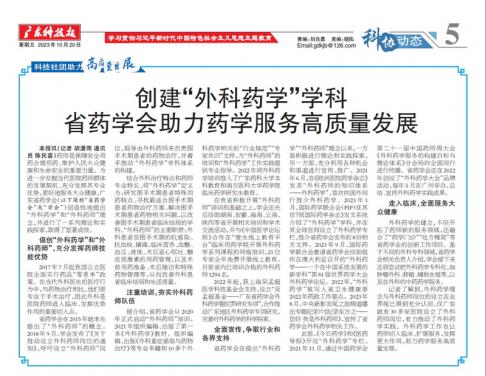 廣東省藥學(xué)會(huì)“外科藥學(xué)”工作入選《廣東科技報(bào)》“科技社團(tuán)助力高質(zhì)量發(fā)展”專(zhuān)題、并作專(zhuān)欄報(bào)道