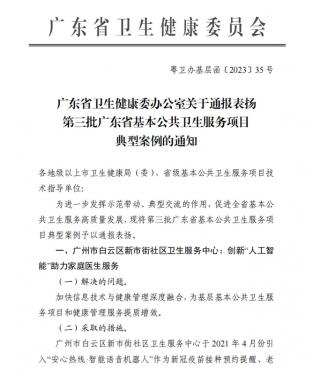 廣州市白云區(qū)新市街社區(qū)衛(wèi)生服務(wù)中心“創(chuàng)新‘人工智能’助力家庭醫(yī)生服務(wù)”項(xiàng)目榮獲廣東省衛(wèi)生健康委通報(bào)表