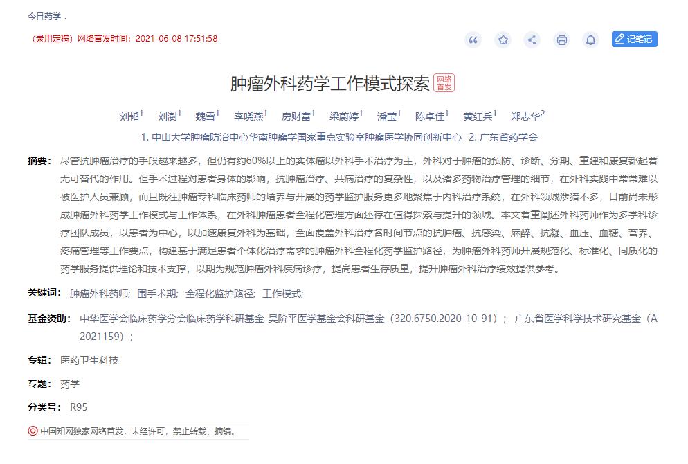 外科藥學(xué)專科化探索——《腫瘤外科藥學(xué)工作模式探索》發(fā)表