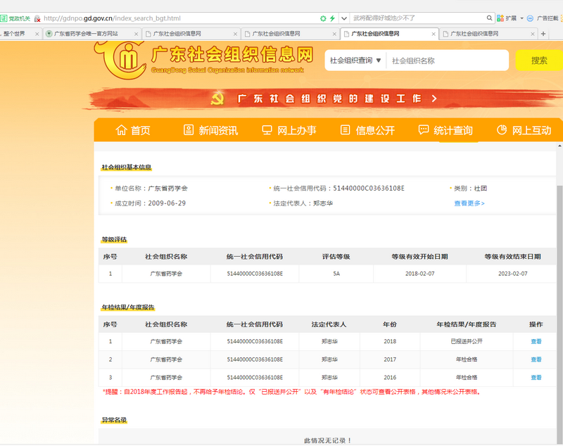 相關(guān)查看路徑:http://gdnpo.gd.gov.cn/> 信息公開(kāi) > 信用信息公示> (在社會(huì)組織名稱(chēng)框輸入)廣東省藥學(xué)會(huì)> 搜索。