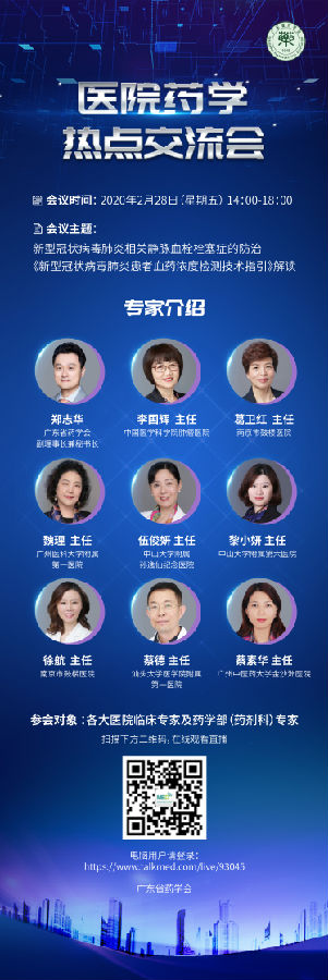 目前新型冠狀病毒肺炎的防疫工作已進(jìn)入關(guān)鍵階段。廣大醫(yī)院藥師與其他醫(yī)務(wù)人員一道,積極為防疫工作貢獻(xiàn)力量。為提高醫(yī)院藥師在目前防疫工作水平,本會(huì)現(xiàn)決定舉辦“廣東省醫(yī)院藥學(xué)熱點(diǎn)交流會(huì)”,就新型冠狀病毒肺炎相關(guān)靜脈血栓栓塞癥的防治,以及廣州醫(yī)科大學(xué)附屬第一醫(yī)院藥學(xué)部、廣州呼吸健康研究院臨床病毒室牽頭制定的《新型冠狀病毒肺炎...發(fā)布時(shí)間:2020-02-26 10:14:02 | 瀏覽:999 -