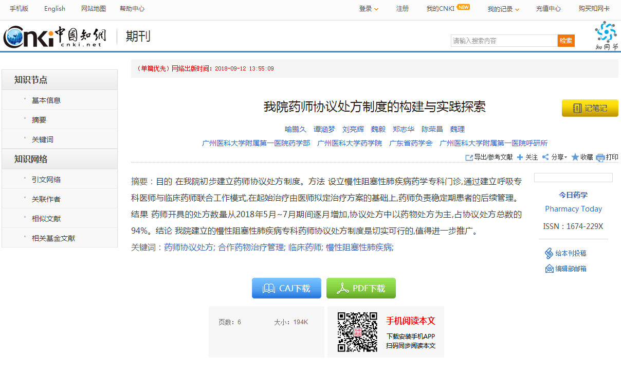 廣州醫(yī)科大學(xué)附屬第一醫(yī)院的藥師協(xié)議處方制度的構(gòu)建與實踐探索在本會官刊——《今日藥學(xué)》雜志發(fā)表